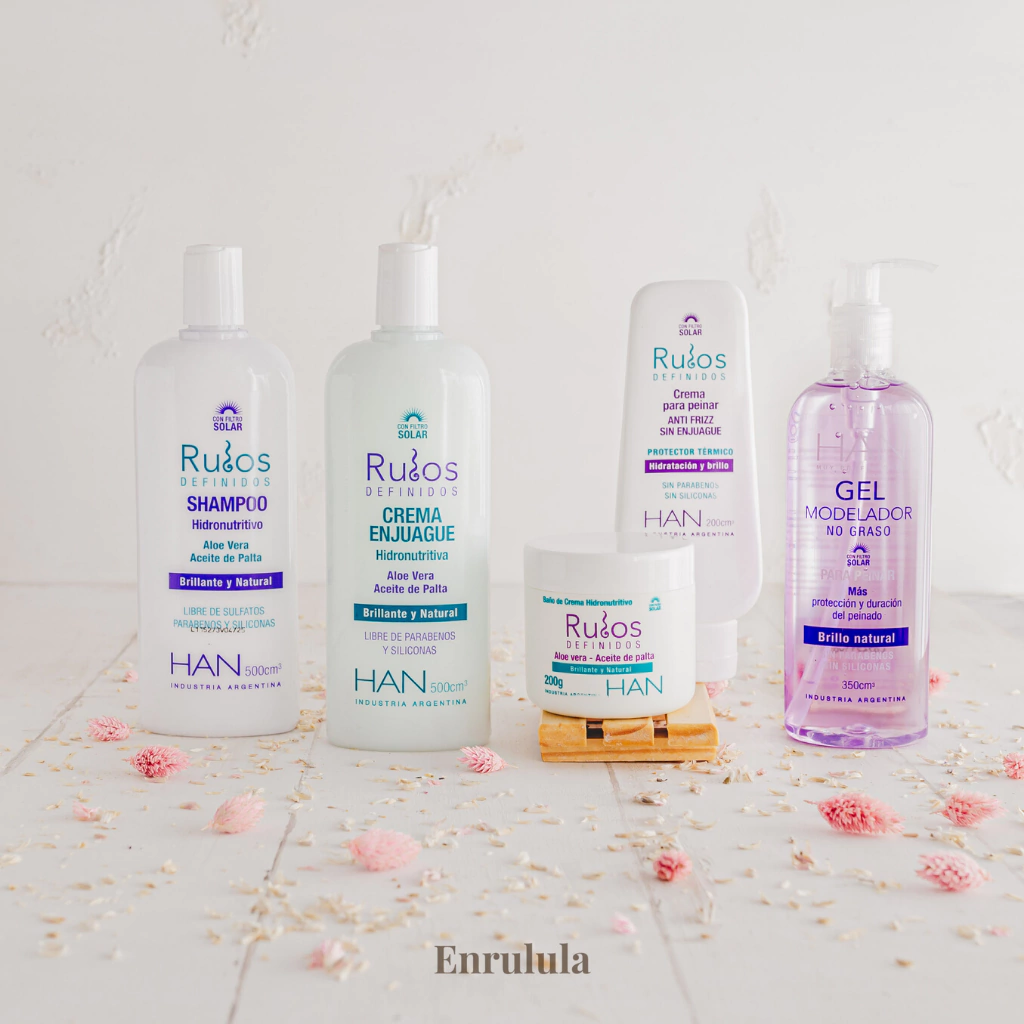 Incluye: 1 shampoo rulos definidos x 500 ml, 1 acondicionador rulos definidos x 500 ml, 1 crema de peinar rulos definidos x 200 ml, 1 máscara de tratamiento rulos definidos x 200 cc, 1 gel modelador no graso x 375 cc